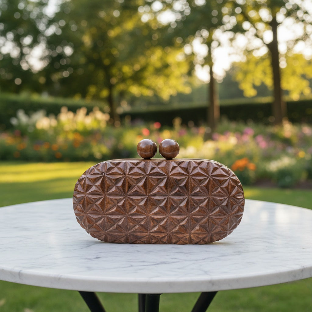 Experience the ultimate in Minimal Luxury with our Handcarved Capsule Clutch Bag. Expertly crafted by artisans, this bag features a stylish wood knob and is made from high-quality wood for a touch of elegance and sophistication. Measuring 9"x4.5", it can easily fit your mobile and comes with a black satin lining and chain. Take your style to the next level with this exquisite clutch.